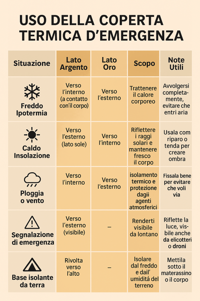 La coperta termica d’emergenza ha molteplici utilizzi. Può trasformarsi in un telo per creare un riparo improvvisato o una tenda. È anche utile per segnalare la propria posizione, grazie al suo colore argento/oro che riflette la luce e si fa notare da lontano. Inoltre, funge da base isolante dal terreno, evitando che il calore si disperda.