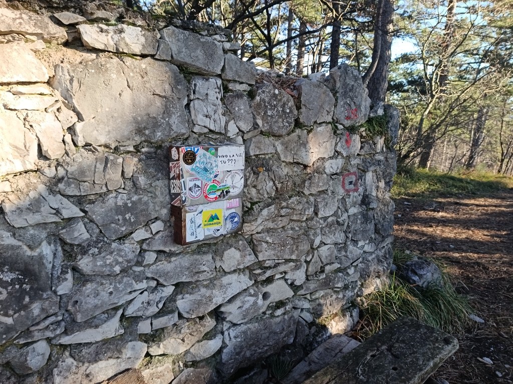 Dopo, ho deciso di deviare verso San Servolo, dirigendomi verso il castello. Qui, di recente, è stato installato un nuovo cartello informativo sui sentieri della zona, completo di timbro di vetta, che si aggiunge a quelli già presenti sul muro del castello.