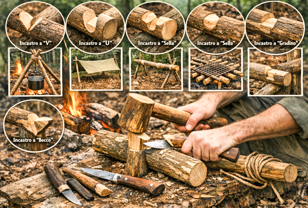 Gli incastri, o notching, rappresentano il linguaggio fondamentale del bushcraft. Si tratta di una serie di intagli ben studiati – a V, a U, a sella, a becco e a gradino – che consentono di unire pali e listelli senza l’uso di chiodi o viti. Sfruttando la geometria e la compressione delle fibre, si possono creare rifugi, graticole, tripodi, supporti per pentole e telai di tarp che sono sia stabili che smontabili. Questa tecnica richiede una buona comprensione della fibra, misurazioni “a secco” dei punti di contatto e tagli progressivi che privilegiano la precisione rispetto alla forza. È importante evitare di indebolire il pezzo con asportazioni eccessive e correggere l’allineamento con piccoli cunei ottenuti tramite batoning. La scelta del materiale, come il legno verde per la flessibilità o il legno stagionato per i carichi, insieme a un’attenzione particolare alla sicurezza – come superfici stabili, mani lontane dalla linea di taglio e verifica dei carichi – è fondamentale per garantire l’affidabilità della struttura. Quando praticati con etica, come il prelievo minimo, la preferenza per il legno morto e il rispetto degli equilibri locali, come nel Carso triestino, gli incastri trasformano la costruzione in un atto di adattamento intelligente, dove tecnica e ambiente collaborano per creare strutture leggere, funzionali e reversibili.