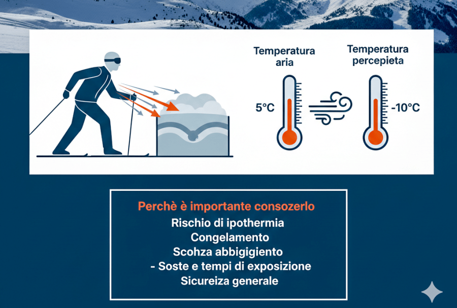 Esempio pratico: con una temperatura reale di +3 °C e vento a 60 km/h, il corpo può percepire una temperatura vicina ai -14 °C.