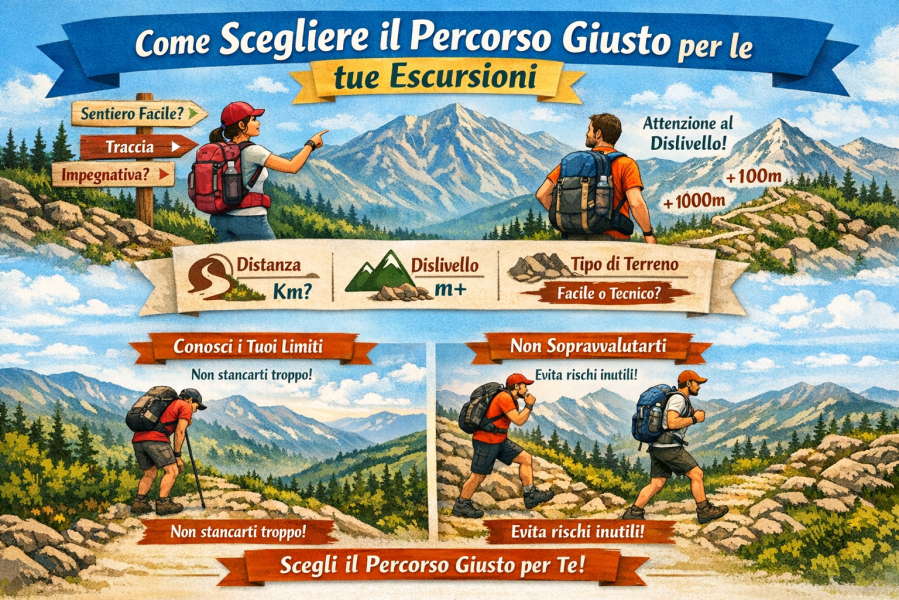 Scegliere il percorso giusto è uno degli aspetti più importanti per vivere un’escursione in sicurezza e con soddisfazione: prima di partire è fondamentale fermarsi un attimo e valutare con sincerità il proprio livello di allenamento, chiedendosi non solo quanto si è in forma, ma anche se si è già affrontato un dislivello simile a quello previsto, perché è proprio il dislivello – più ancora dei chilometri – a fare la differenza.